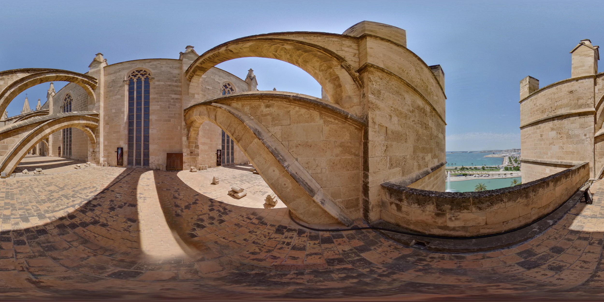 To reach the roof terrace, visitors need to climb a series of stairs that lead to the upper levels of the cathedral. As you ascend, you'll notice the intricate details of the interior, with elaborate stained glass windows and grand vaulted ceilings.