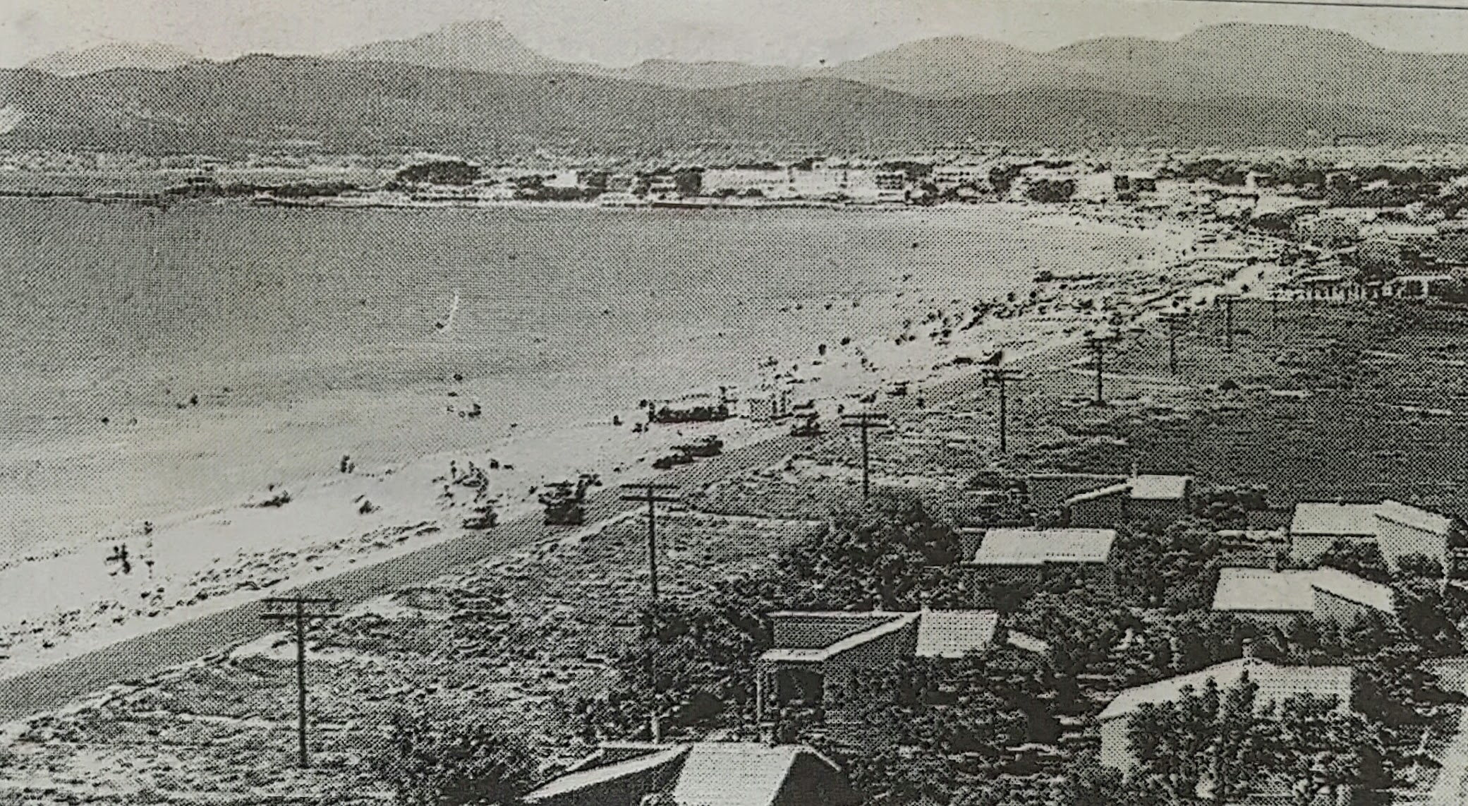 El Arenal Beach, located on the beautiful island of Mallorca, Spain, is known for its expansive sandy shores and clear waters. This vintage photograph captures an era when the beachfront was dotted with fewer buildings and less commercial development, highlighting the natural beauty and serene atmosphere of the past.